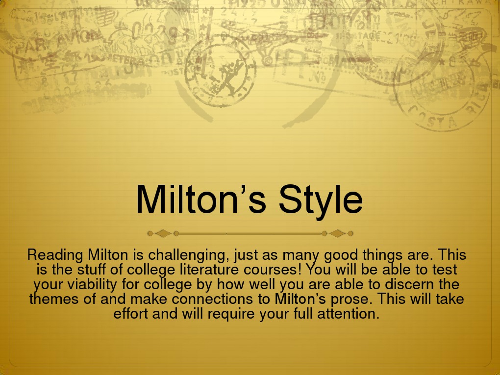 The poetic style of John Milton, also known as Miltonic verse, Miltonic epic, or Miltonic blank verse, was a highly influential poetic structure popularized by Milton. Although Milton wrote earlier poetry, his influence is largely grounded in his later poems: Paradise Lost, Paradise Regained, and Samson Agonistes.